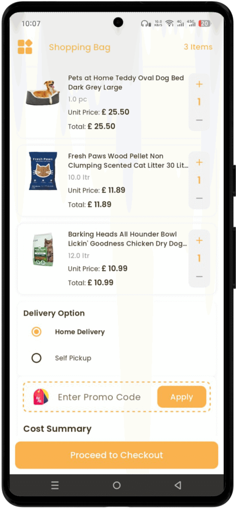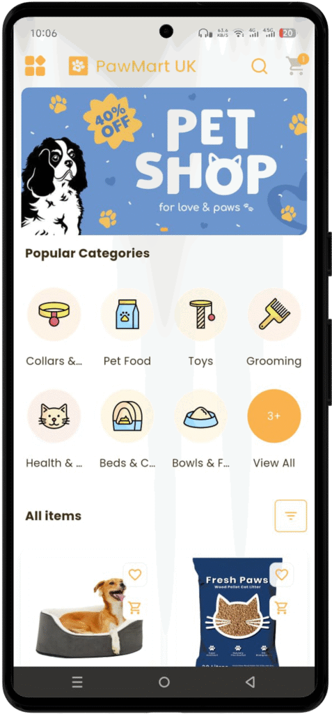 A modern pet care and shopping app designed for the UK market, offering effortless browsing, transparent checkout, and real-time delivery tracking — making pet care simple, fast, and fun.