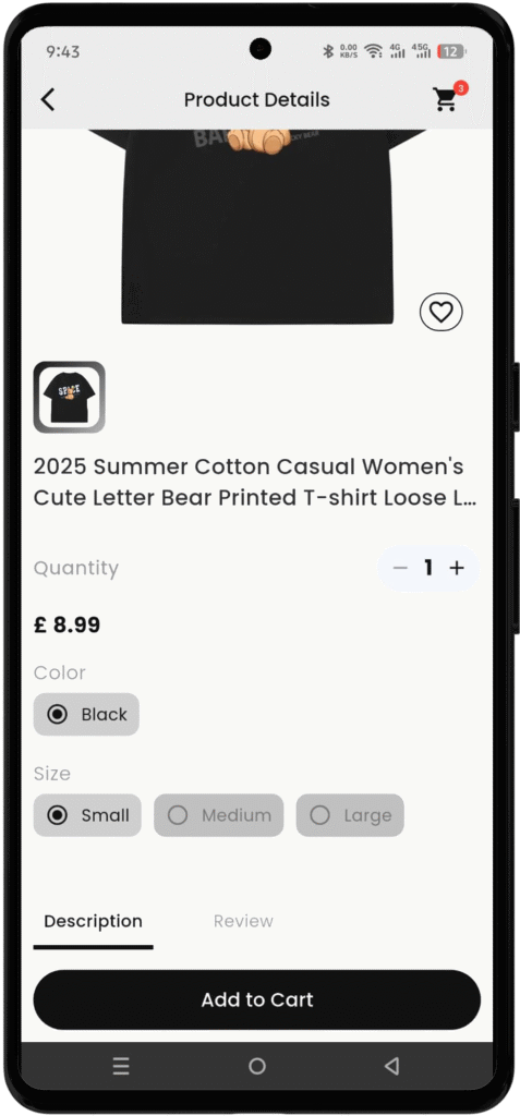 Choose color, size, and quantity directly on the product page. Attribute selection updates price and availability in real time, delivering a smooth customization flow.