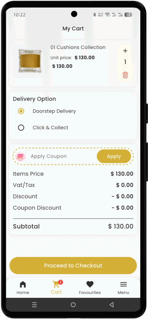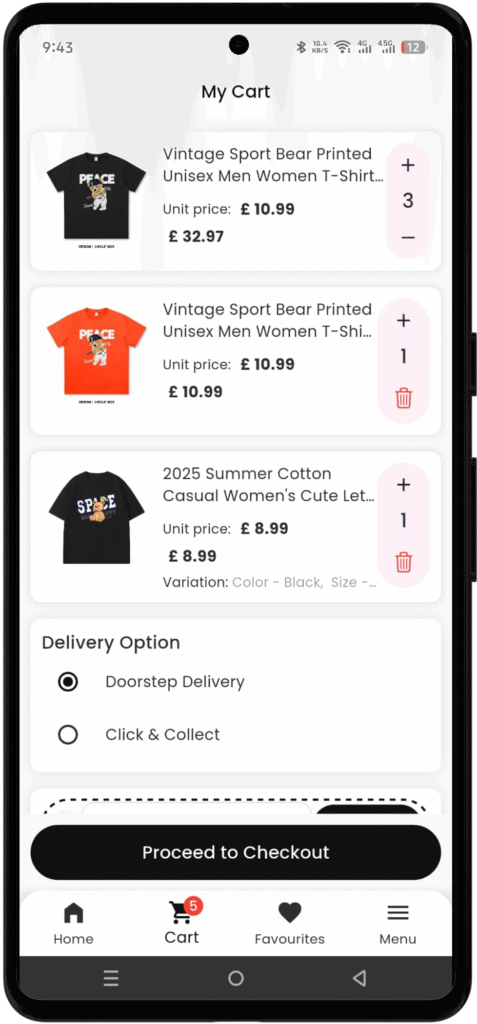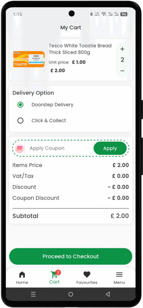 Add, remove, or update products effortlessly with a real-time price summary. Built-in coupons and delivery preferences make checkout quick and hassle-free.