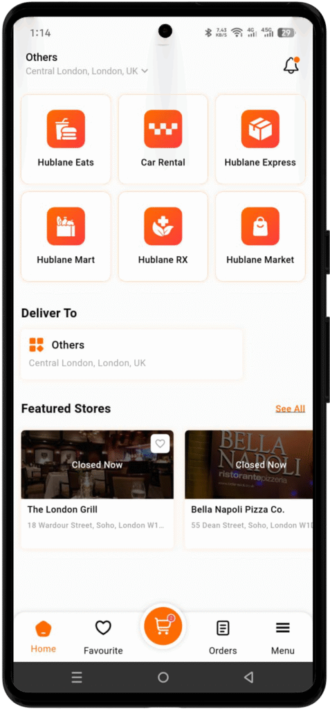 Hublane is a UK-based multi-module delivery and service platform offering food, grocery, parcel, pharmacy, car rental, and e-commerce — all under one app.